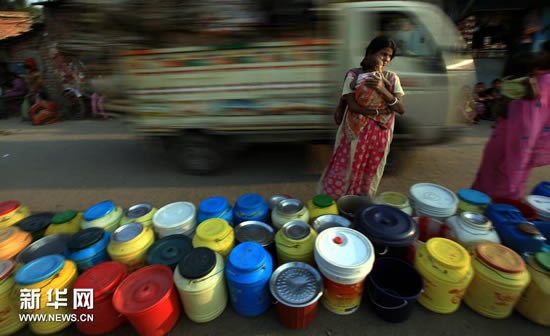 2011年3月12日,在印度加尔各答,一名印度女子排队等待饮用水供应。每年3月22日是世界水日。今年世界水日旨在让国际社会关注诸如迅速增长的城市人口、工业化、以及因冲突、自然灾害和气候变化所造成的不确定性因素对城市供水系统的影响。(资料照片)